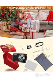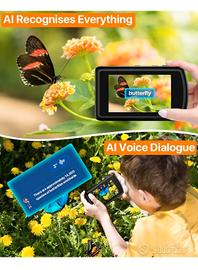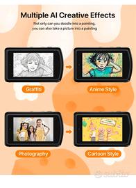 Riconoscimento Intelligente AI】Questa macchina fotografica digitale ha la funzione di riconoscimento intelligente AI di vari oggetti. Identificherà le cose per voi in base alle foto scattate (questa funzione richiede una connessione WIFI o hotspot mobile). È possibile scegliere di rispondere a uno qualsiasi degli 11 personaggi AI, fornendo conoscenze interessanti. Questa fotografica digitale compatta può anche effettuare dialoghi interattivi vocali con personaggi AI puri, migliorando così le capacità di comunicazione dei bambini. 【Doppia Fotocamera Anteriore e Posteriore & Trasmissione WiFi】Questa fotocamera digitale compatta intelligente AI 1080P può commutare la doppia macchina fotografica anteriore e posteriore con un solo clic, la fotocamera bambini anteriore scatta selfie facilmente e la fotocamera posteriore scatta immagini e video interessanti. Questa fotocamera digitale supporta la trasmissione Wifi di immagini e video, è possibile caricare le foto sul telefono cellulare tramite APP. È sufficiente scaricare l'APP “AI Cam Transfer” sul telefono cellulare per trasferire in modalità wireless foto e video al telefono cellulare o al tablet e condividerli su Facebook, YouTube, Skype e altri social media. 【Messa a Fuoco Automatica & Display Tattile】Questa macchina fotografica bambini è dotata di un display touchscreen IPS HD da 3,6 pollici, che consente di ingrandire e ridurre la messa a fuoco e di regolare la distanza del soggetto da fotografare attraverso lo schermo touchscreen. Questa macchina fotografica digitale compatta è dotata anche di una funzione di messa a fuoco automatica, in grado di mettere a fuoco automaticamente e con precisione il soggetto per scattare immagini vivide e nitide, catturando facilmente momenti chiari e meravigliosi.(Supporta schede Micro SD fino a 32 GB) 【Flash Automatico & Batteria ad Alta Capacità】Questa fotocamera digitale compatta intelligente AI è dotata di un flash LED integrato ad alta potenza,