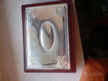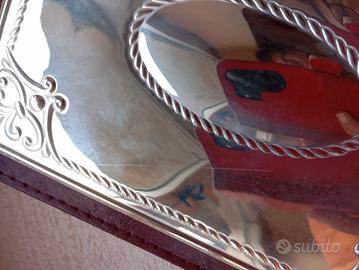 Album foto con velina in pelle e argento Per 30 foto cm. 15x21 L'applicazione di argento ricopre la copertina in quasi tutta la sua interezza Ed ha una piccola righetta che non si nota molto La prima velina risulta leggermente rovinata come documentato da foto Per il resto ottime condizioni
