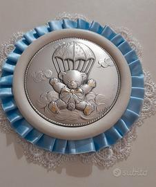 per conto terzi vendo album porta foto, con medaglione in argento bassorilievo Castellani, raffigurante un orsacchiotto paracadutista. L'album misura 22x24 ed è nuovo, ha la sua custodia in velluto e La scatola, perfettamente conservata.
