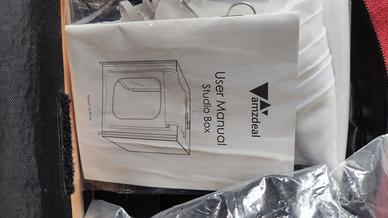 set completo Amzdeal Studio Box (Modello ZK-RY-06) per fotografia di prodotto professionale. Ideale per chi ha bisogno di scatti puliti e luminosi per e-commerce e cataloghi. Il kit include: - Struttura pieghevole: Box lighbox di alta qualità, facile da montare e smontare. - Illuminazione LED - 3 sfondi: bianco, nero, arancione - Accessori: Clip di fissaggio, cavi di alimentazione e manuale d'uso originale. - Borsa da trasporto: Custodia nera con manici per il trasporto in sicurezza (visibile in foto). Condizioni: L'oggetto è in ottime condizioni, i componenti interni sono ancora imbustati e pronti all'uso. La borsa è integra e le cerniere funzionano perfettamente. Dettagli: Marca: Amzdeal Versatilità: Aperture multiple per scatti frontali o dall'alto. Consegna: Disponibile per ritiro a mano a Trieste o spedizione tramite TuttoSubito.