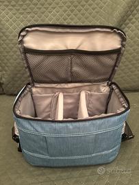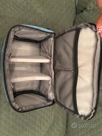 Vendo borsa a tracolla colore azzurro per fotocamera. Materiale poliestere, con un certo grado di idrorepellenza.