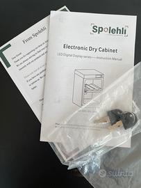 Vendo Armadietto a secco per temperatura e umidità controllata, utilissimo per riporre, custodire e preservare fotocamere, obiettivi, materiale elettronico o cartaceo. Illuminazione interna. Inoltre, protegge anche dalla polvere. Acquistato, ma poi mai messo in uso, poiché ho optato per altre soluzioni. Dimensioni esterne H 44 X L 31,5 X P 32 cm, dimensioni interne H 37 X L 29 X P 28 cm. Non spedisco, accetto solo pagamento in contanti al momento del ritiro.