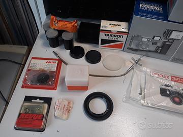 n.2 Pentax me super 1 50 pentax f1.7 1 28 pentax f2.8 1 zoom micron 80/200 f4 macro kiron, 1 catadiottrico osawa 650 f 8,5 , 1 winder Pentax me II , 1 starblitz 2600 gts , filtri, paraluce istruzioni ed imballi originali etc come da foto, non si spedisce e prezzo poco trattabile solo in blocco, oppure scambio con orologi meccanici vintage omega longines zenith di mio gradimento