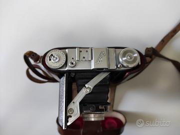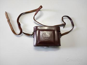 Fotocamera a soffietto 6x6, utilizza pellicola 120 medio formato.Made in Germany, corpo in metallo e pelle, con custodia originale in pelle marrone.