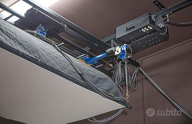 Comodissimo sistema aereo motorizzato a soffitto Fatif su rotaie. Lunghezza totale 7 m. (2 segmenti da 3.5m montati) con telecomandato a infrarossi per tutti i movimenti e relativa centralina multicanale dedicata, comprendente un bank Windowlight Lucifero con alogene e bulbi flash incorporati 150x105x50 cm e ventola raffreddamento. Affare per chi se ne intende.