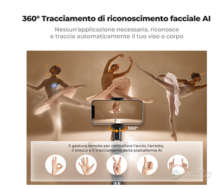 Vendo Bastone selfie 180cm tripode con seguimento automatico AI 360° , più luci e telecomando. Bastone selfie Multifunzione, professionale . Nuova con scatola e accessori. Il bastone ha una telecamera con IA integrata che segue a 360° il volto o la persona/e che registrano o fanno foto . È pieghevole e automatico. Ha inclusi 2 anelli lumonosi a ricaricabili da attaccare di lato o sopra . Ha i controlli con le gesture e i movimenti . Ha un telecomando bluetooth per impostare le varie scene 7 in 1. La base si apre a 3 ganci per essere appoggiato , è allungabile fino a 1.80 m . Da 37 cm fino a 180 cm. 5 gesti per attivare diverse funzioni , fino ad una distanza di 10 metri . Ci si possono attaccare telefoni di ogni dimensione e varie action cam avendo la filettatura standard . Stabilizzato , braccio panoramico a 360 gradi , asta per selfie, treppiede da terra , in lega di alluminio e abs , leggero con busta per il trasporto . Dal telecomando si può attivare lo zoom , mettere like durante le live. Adatto a chi piace fare viedo con massima stabilità, a chi fa tik tok , live streaming sulle varie piattaforme, video youtube, twich, instragram etc . Adatto ad uso professionale o uso privato . Si possono creare infinite scene e dare massimo sfogo alla creatività digitale. Multiuso e Multifunzione.