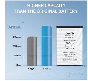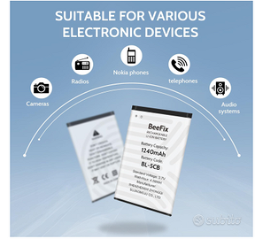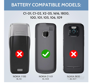 Batteria BL-5CB 1240mAh Potenziata per Nokia 105, 100, 1616, C1 Dai nuova vita al tuo classico Nokia con questa batteria BL-5CB ad alta capacità! Rispetto alle batterie standard da 1050mAh, questo modello Beefix offre ben 1240mAh, garantendo una durata maggiore per chiamate e standby. Compatibilità Precisa: Sostituzione ideale per i telefoni cellulari Nokia base. Compatibile con: Nokia serie 100: 100, 101, 103, 105, 106, 109 Nokia serie 1000: 1280, 1616, 1800 Nokia serie C: C1-01, C1-02, C2-01, C2-02, C2-03, C2-06 Nokia serie X: X2-01, X2-05 Altri modelli: 111, 113 ⚠️ Nota importante: verificare bene il codice. Compatibile solo con BL-5CB. Non compatibile con BL-5C, BL-5CA o altri modelli simili. Perché scegliere questa batteria? Capacità Maggiorata: 1240 mAh per una durata superiore alla media. Qualità Beefix: Batteria nuova (Zero Cicli) progettata per resistere a numerosi cicli di ricarica. Sicurezza Integrata: Dotata di chip IC per proteggere il tuo telefono da sovraccarico, scarica profonda, cortocircuito e surriscaldamento. Sostituzione Rapida: Si installa in pochi secondi senza attrezzi, esattamente come l'originale. Specifiche: Modello: BL-5CB Capacità: 1240 mAh Condizione: Nuova Spedizione: Rapida e tracciabile. L'oggetto verrà imballato con cura per evitare danni durante il trasporto.