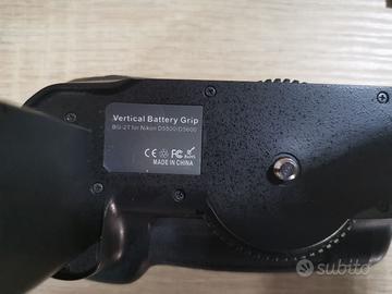 Vendo un battery grip per fotocamere reflex Nikon D5500 e D5600, usato ma perfettamente funzionante, Migliora la presa della fotocamera e permette di inserire due batterie per prolungare l'autonomia. Per l'installazione richiede la rimozione dello sportellino della fotocamera (operazione abbastanza semplice). Incluso solo il battery grip con il cavetto per poter utilizzare il pulsante di scatto integrato. Lo vendo a 10 euro (NON TRATTABILI)