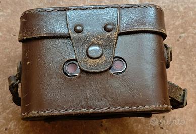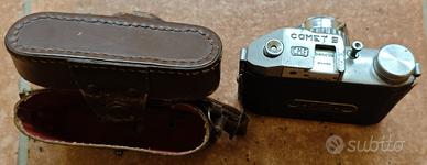 Rara fotocamera analogica italiana Bencini Comet S (CMF Bencini Milano), anni '50, icona collezionismo! Pronto usa film 127, formato 4x4cm, primo modello sincronizzato flash. Specifiche Tecniche: Film: 127 (16 pose 4x4cm, pellicola rara ma disponibile Lomography ~15€). Obiettivo: Bencinar 55mm f/11 fisso (meniscus), messa a fuoco manuale scala metri (da 1m infinito), filettatura filtri/paraluce. Otturatore: Guillotine 1/50s + B (posa bulb), sync flash PC (sincro X). Diaframma: Fisso f/11 (non regolabile). Film: 127 rollfilm, 16 pose 3x4cm (127 standard). Altro: Viewfinder, corpo alluminio 110x72x60mm, 270g, esposizioni multiple facili. Condizioni: Buone vintage, Leggeri segni tempo/patina, completa custodia cuoio originale + tracolla. No pellicola.