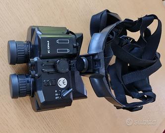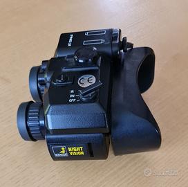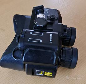 Si tratta del NightVision "Moonlight" PNG2 (Passive Night Glass 2), di probabile costruzione israeliana. La visione restituita è di colore verde, come da foto, e non ha ingrandimenti, per non falsare la percezione di quanto osservato. Ciascun tubo ha la sua regolazione diottrica e di messa a fuoco ed è inoltre possibile regolare la distanza interpupillare. Funziona con due normalissime batterie stilo AA. Nel (raro) caso di buio assoluto, in assenza cioè di una sia pur flebile sorgente luminosa da amplificare, è provvisto di illuminatore ad infrarosso, selezionabile tramite l'apposito deviatore.