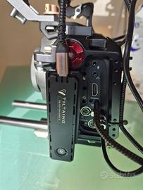 La macchina ha il cage completo Tilta comprendente le rode da 15mm, la piastra per alimentare la camera con batterie NP970, 2 case per SSD M2, viewfinder originale più supporto, cavi XLR, 3 batterie NP970 + 1 NP930. Senza scatole ma il tutto in una borsa professionale.