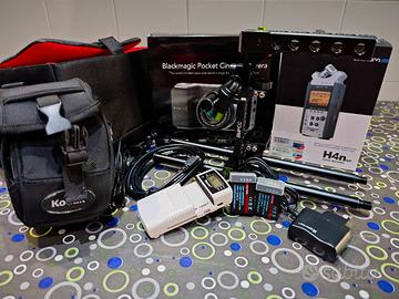 Vendo per non utilizzo una bellissima Blackmagic pocket 1080p con accessori. La camera è perfetta funzionante e usa la montatura micro 4/3. Inoltre si vende compreso nel prezzo il rig Lamparte originale per questa camera, lo zoom H4sp, due batterie aggiuntive con caricabatterie, una borsa, una porta camera e cavetteria di servizio.