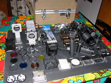 Corredo fotografico Olympus composto da 2 corpi macchina (OM 1 e OM2 SP nera), ottiche originali Zuiko 35mm/2.8 - 50mm Macro/3.5 - 135 mm/3.5 - Ottica 20mm Kenlock/2.8 - Zoom Vivitar Series 1 70-210/2.8. Winder 2 Olympus - Staffa Flash Power Bonce Grip 2 Olympus - Flash T32 Olympus - Slitta Macro Auto Bellows Olympus Con Slide Copier Olympus - Mirino Angolare 1/2/2.5 Olympus - Scatto flessibile Olympus - Tubi prolunga 1x-2x-3x Kenlock - Decine di filtri Cokin e lenti UV-Polarizzate e Creative - Cavi Grip per scatto - Borsone GM Express in alluminio, robustissimo per doppio corredo fotografico. Vendo in blocco no pezzi singoli.