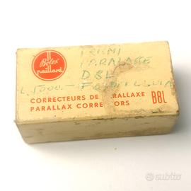 Set originale di prismi correttori di parallasse per cineprese Bolex Paillard (modelli B8L e C8SL), completo di istruzioni e scatola d'epoca. Questi accessori sono fondamentali per la fotografia e la cinematografia a distanza ravvicinata (macro), dove la discrepanza tra ciò che vede l'obiettivo e ciò che vede il mirino (appunto la parallasse) diventa significativa. Dettagli del Set Il foglio illustrativo spiega come utilizzare questi prismi per compensare l'errore di inquadratura: Prisma da 25 cm (Codice: VAPAR): Utilizzato per riprese a una distanza di circa 1 piede (30 cm). Prisma da 50 cm (Codice: VAPIE): Utilizzato per riprese a una distanza di circa 2 piedi (60 cm). Come Funzionano Compensazione Ottica: Il prisma viene inserito davanti al mirino. La sua inclinazione devia il raggio visivo del mirino verso l'asse dell'obiettivo. Allineamento: Grazie a questa deviazione, il campo visivo inquadrato nel mirino corrisponde esattamente a quello catturato dalla pellicola alla distanza specifica indicata sul prisma. Montaggio: Come mostrato nelle figure del manuale, il prisma si incastra tra l'alloggiamento del fotometro e il mirino, con un'inclinazione di circa 45°. Valore Storico L'oggetto è un tipico esempio della precisione meccanica svizzera della Bolex Paillard. La presenza della scatola originale con il prezzo scritto a mano e del manuale multilingue (tedesco, inglese, francese e spagnolo) lo rende un pezzo da collezione molto interessante per gli appassionati di cinematografia analogica in formato 8mm. Prodotto vintage, risalente presumibilmente agli anni '50 o '60.