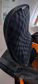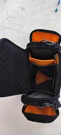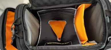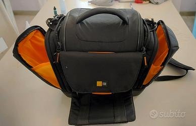 Borsa per macchina reflex, ampio vano centrale con sistema di ancoraggio in sospensione body+lente. Ampi scomparti laterali, cerniere perfettamente funzionanti, imbottitura e rivestimento integri, pochissimi segni di usura.