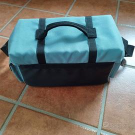 Borsa di colore grigio azzurro, ben imbottita, munita di maniglia, due cinghie di chiusura e tracolla regolabile con imbottitura per spalla stesso colore della borsa. Tre capienti tasche con chiusura a strappo (velcro): una anteriore e due laterali. Lo spazio interno può essere regolato tramite divisori imbottiti posizionabili con sistema a strappo. Sul lato inferiore del coperchio 3 piccole tasche a rete e 8 alloggiamenti estensibili per accessori aggiuntivi.