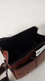 Grande borsa a tracolla impermeabile vintage in eco-pelle per fotocamera. Dimensioni esterne: 30 x 14 x 21 cm, colore:Rosso-marrone. L'altezza interna è di 190 mm, in modo da poter inserire una fotocamera con obiettivo 70 - 300 mm in verticale nella custodia. Tracolla regolabile, chiusura magnetica a sovrapposizione. Realizzato in eco-pelle di buona qualità.
