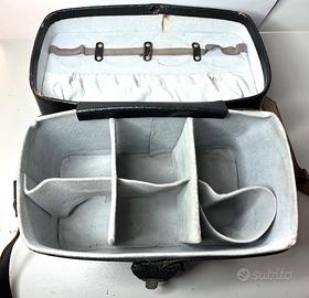 Vendo borsa in pelle nera goffrata vintage, Made in Germany, anni 60-70, misure: 25,5 (L)x14 (P)x19,5(H) cm, con divisori interni per 6 obiettivi (o 4 obiettivi e corpo macchina), e porta filtri. Bella patina. La tracolla è abbastanza logora. Regalo cinghia in materiale sintetico lungh. 110 cm.