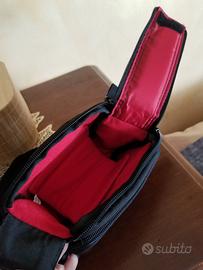 Borsa per fotocamera a marchio Hama, colore nero con iconico interno rosso acceso. La borsa è molto capiente nonostante le dimensioni compatte, ideale per proteggere il corpo macchina e un obiettivo extra o accessori.