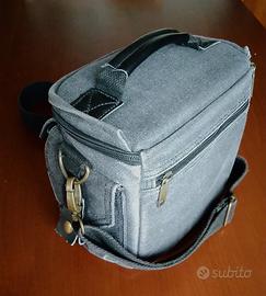 Vendo borsa fotografica ideale per trasporto fotocamera mirrorless e 2/3 obiettivi, in canvas e stile vintage colore grigio scuro.