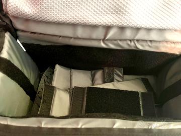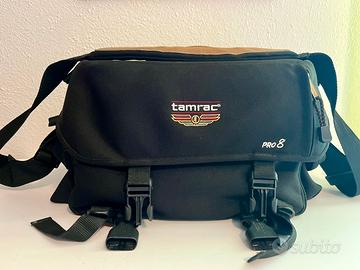La Tamrac Pro 8 è una borsa fotografica professionale a tracolla progettata prr trasportare in sicurezza un corredo fotografico completo. È realizzata in materiali robusti e impermeabilizzati , con imbottitura interna per proteggere l’attrezzatura. Può contenere 2 corpi macchina reflex ( anche con obiettivo montato) , diversi obiettivi aggiuntivi ( circa 4 o 5 ) , un flash e vari accessori. Dimensioni interne cm 32-15-18 Dimensioni esterne cm 42-23-23