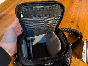 Borsa a tracolla per mirrorless con obiettivo collegato + accessori.
