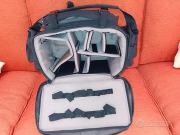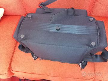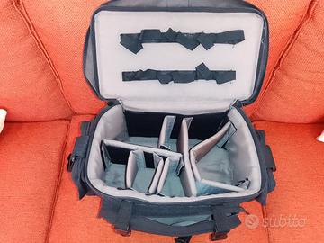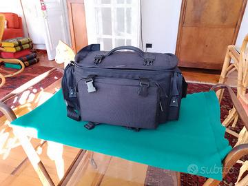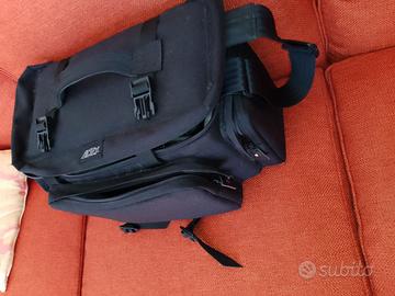 Borsa Altex per trasporto macchina fotografica ed obiettivi. Colore nero, con tracolla. Ampio vano centrale sagomabile con i divisori imbottiti fissati con velcro, due tasche laterali, una frontale ed una posteriore. Tutte le chiusure sono a cerniera. La borsa e’ dell’epoca fotografia analogica e nell’interno del coperchio si trovano elastici (un po’ frusti…) porta rullini. Nella parte inferiore frontale due cinghie consentono di fissare il treppiede. Dimensioni borsa circa cm 46 x 26 x 26, tasca frontale cm 30 x 19 x 5, tasche laterali cm 20 x 15 x 4, tasca posteriore cm 25 x 17. La tasca principale misura circa cm 36 x 22 x 22. Le foto fanno parte integrante della descrizione