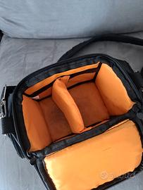 borsa per macchina fotografica nera interno arancione con tracolla regolabile, tasche esterne per accessori con zip e divisore interno regolabile con velcro dimensioni 23x14x18 cm (BxLxH) usata ottime condizioni