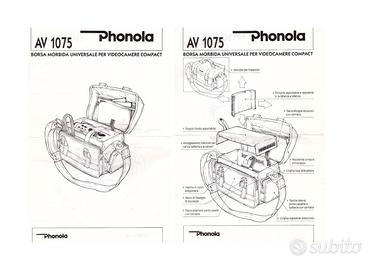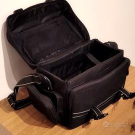 Borsa morbida universale per videocamera compact, “PHONOLA”, colore nero, in tessuto cucito, munita di maniglia per trasporto a mano e spallabile con cinghia regolabile antiscivolo, corredata di tasca interna e tasche nella parte anteriore, posteriore e laterali esterne con chiusura a cerniera. All’interno è provvista di doppiofondo asportabile e divisorio asportabile e regolabile in altezza e lunghezza, cinghia fissa di bloccaggio interna, alloggiamento sul fondo per batterie e accessori, fondo esterno di appoggio rinforzato. Ideale anche per trasporto di attrezzature per macchine fotografiche per passione amatoriale o da turismo. Le dimensioni sono di 40 centimetri di lunghezza x 19 centimetri di larghezza x 21 centimetri di altezza. Poco usata, ottimo stato, come nuova. Vendo ad interessato a 30 Euro + 10,30 Euro per spedizione postale con pacco ordinario tracciabile su territorio nazionale. No corrieri. Astenersi indecisi e perditempo.