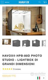 Vendo box fotografico professionale HAVOX HPB-80D, perfetto per scattare foto di prodotti ad alta qualità, ideale per e-commerce, artigiani, collezionisti o fotografi.