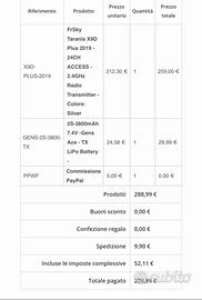 Vendo kit FPV completo per inutilizzo, tutto materiale come NUOVO volato mezza volta, ancora con pellicole/confezioni originali. Valore commerciale totale oltre 1350€. Drone: HGLRC Sector X5 6S Analogico (Ricevente TBS Nano RX) -300€ Radio: FrSky Taranis X9D Plus 2019 ACCESS con Modulo TBS Crossfire Micro TX V2 -250€ Occhiali: Skyzone SKY02O OLED con ricevitore Steadyview -300€ Batterie: 3x Tattu Funfly 6S 1550mAh + Batteria dedicata per radio -100€ Accessori: Caricabatterie professionale, eliche di ricambio HQ Ethix -50€ Disponibile per ritiro a mano o spedizione. No perditempo. Prezzi dimostrabili tramite fatture fornite in foto. Disponibile a vendere anche componenti separatamente.