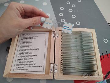 Il bundle è 280€, mentre con 20€ in più aggiungo (non presenti in queste foto ma se chiedete ve li faccio vedere senza problemi) anche una confezione di vetrini portaoggetto e coprioggetto vuoti, delle pipette Pasteur graduate in vetro da 0.5, 1, 2, 3, 5 e 10 ml ed un kit da dissezione praticamente inutilizzato (non adatto a bambini).