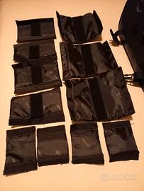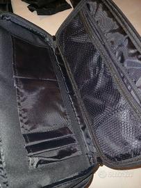 Borsa per attrezzatura fotografica in nylon-tracolla regolabile con spallaccio imbottito-2 manici avvolti in maniglia da trasporto- tascone frontale con zip a doppio cursore bloccabile con lucchetto-2 tasche laterali chiusura strappo-chiusura superiore con pattina sagomata e 2 clips-pannello superiore interno con tasca retata e zip-interno foderato con 5 tasche (scomparto telefono/penne)-11 cuscinetti divisori a strappo-2 solidi piedi sottostanti- NON predisposta per aggancio a trolley-