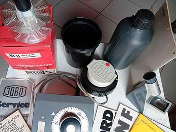 Vendesi attrezzatura per camera oscura in ottimo stato. Comprende: - Tank sviluppatore Jobo n° 1200 sistem 1000 da ml 500 con doppia spirale– Temporizzatore – Focometro Paterson – Diversi libretti e pubblicazioni specifiche - Due tanichette cm 40x33.