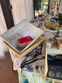 camera oscura completa di ingranditore, obiettivo componon, 2 lampade luce rossa, 1 lampada luce bianca, temporizzatore Philips pdc011, bobinatrice 60 m, sviluppatrice Patterson, 2 vaschette per sviluppo, paper speed.