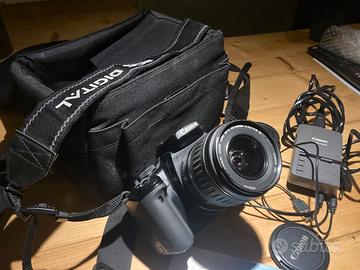 Macchina completa accessori ricrica batteria coperchi per obbiettivo e corpo macchina staffa tracolla cuatodia porta batteria cavo alimentazione custodia morbida originale libretto originale iatruzione e scatola originale.