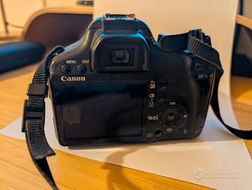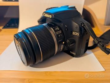 Canon 500 D con obiettivo originale 18/55 mm, in buono stato vendo con batteria di ricambio (vedi foto) e tracolla originale. La fotocamera funziona benissimo. Unico difetto è nello sportellino della batteria che è leggermente danneggiato ma una volta chiuso resta saldo senza pregiudicare il funzionamento della camera e soprattutto senza che la batteria si muova.