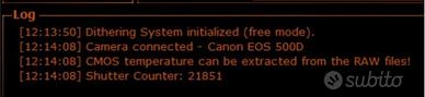 Canon 500D con filtro Baader, raffreddata con cella di Peltier termostatata (si possono quindi creare librerie dark e bias) e con resistenza anticondensa, tutta alimentata a 12V e elettronica di raffreddamento controllabile da pannellino touchscreen. Gestibile da PC come qualsiasi Canon, utilizzabile volendo anche "normalmente" o con temporizzatore. Meno di 22mila scatti. Era commercializzata anni fa anche da Tecnosky, come alternativa alle blasonate CentralDS.