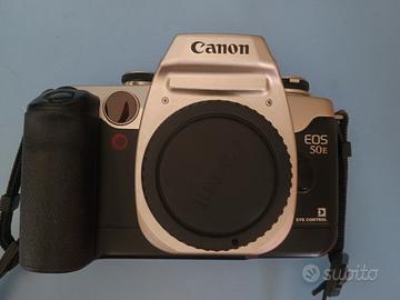 bellissima Canon 50E con messa a fuoco con lo sguardo + pacco batterie per usare anche le normali AA stilo. perfettamente funzionante, Fa delle diapositive da sballo, si può usare anche con gli obiettivi ultrasonica...anzi da il meglio di se.
