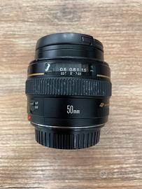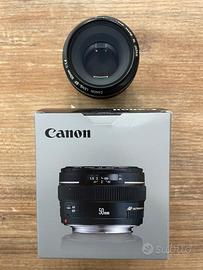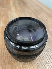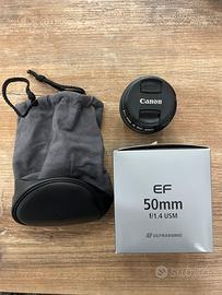 Canon EF 50mm f/1.4 USM. Veloce, silenzioso e preciso, usato ma in ottime condizioni. L'obiettivo è fornito di scatola, custodia originale Canon e filtro UV. Non presenta graffi ne muffe. Nessun problema di messa a fuoco, ghiera fluida. Tenuto con cura maniacale, vendo per inutilizzo.