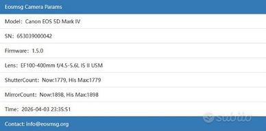 Vendo Canon 5D Mark IV in condizioni eccellenti pari al nuovo, con soli 1779 scatti, sempre trattata MANIACALMENTE (no sabbia, no polvere). Completa di scatola e tutti gli accessori originali (manuale di istruzioni e cinturino ancora sigillati), 2x batterie originali Canon (una LP-E6N e una LP-E6NH che è la versione migliorata da 2130mAh, che offre il 14% di autonomia in più) e 2 schede di memoria da 64GB Sandisk Extreme Pro (una SD e una CF). Vetri temperati di protezione sui due display installati appena tolta la macchina dalla scatola. Nessun graffio o segno di usura. Sensore e specchio perfetti. Elettronica, pulsanti e ghiere perfetti, mai un errore. Vendo per passaggio a mirrorless. Prezzo non trattabile visto che è già basso. Non accetto permute/scambi. Disponibile a qualsiasi prova in provincia di Savona e posso mandare qualunque foto. Spedizione assicurata con corriere o Poste Italiane (da valutare insieme all' acquirente) a carico di chi compra, o scambio a mano in provincia di Savona. Offro massima serietà, so quel che vendo, chiedo cortesemente di astenersi affaristi e perditempo, grazie. Vendo anche: -Canon EF 100-400mm f/4.5-5.6L IS II USM - 1200€ -Canon EF 70-200mm f/4 L IS USM - 450€ -Canon Extender EF 1.4x III - 230€ Tutti gli oggetti sono in condizioni eccellenti. Se interessati a comprare tutto il kit il prezzo è di 2900€ invece di 3080€ + spese di spedizione. Pagamento con Paypal, bonifico bancario o contanti in caso di scambio a mano.