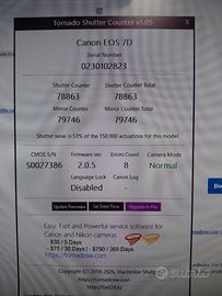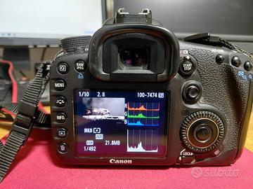 Vendo Canon 7D, 78.863 scatti, completa di batteria originale, 7 schede di memoria, caricabatterie e cavetto usb, istruzioni. Presente anche Battery grip. Attenzione: la macchina è danneggiata sulla scocca vicino alla batteria. Il funzionamento rimane comunque perfetto