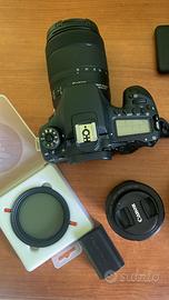 L'attrezzatura è pari al nuovo. La macchina ha all'attivo MENO DI 10.000 SCATTI. Tenuta sempre in borsa imbottita, sensore pulitissimo e lenti immacolate.