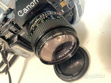 Canon A1 del 1982, funzionante e in ottime condizioni, ancora dotata della custodia in pelle che tuttavia è deteriorata dal tempo. Venduta assieme a obiettivo 50mm originale, filtro Canon 52mm skylight e teleobiettivo Tamron (con relativa custodia) 80-210mm macro. Le lenti sono tutte in ottime condizioni.