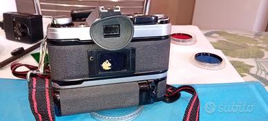 CANON Ae1 usata pochissimo, con obiettivo 50 mm f1,8 perfetto e motore dedicato. La fotocamera è funzionante, con batteria nuova (1 mese di vita). qualche piccolo segno estetico dovuto all'età. Compresi paraluce, flash a torcia Philips, tracolla nuova e filtri Kenko LBC12 blu, Tamron R2 rosso, Metro 02 arancio per b/n , diamentro 55 mm. REGALO flash originale Canon Speedlite 155A funzionante ma con zoccolo di plastica scheggiato.