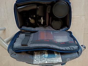 Fotocamera AE1 Canon Obiettivo 70-210 Canon Obiettivo 50 Canon Obiettivo 28-105 Vivitar Grandangolo 17 Tamron con filtro pol. 2x Kenko Flash 6 filtri effetti speciali Borsa