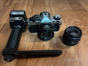 Canon AE1 Program con obbiettivo originale più grandangolare f-28 più moltiplicatore di focale 2x borsa accessori come da foto vari filtri a corredo.