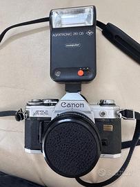 Canon At-1 analogica anni 70 con obiettivo e flash. Spedizione disponibile da concordare insieme