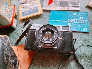 Tutto perfettamente originale e ben conservato: macchina fotografica, custodia in pelle, scatola, libretto di istruzioni, guida rapida all' utilizzo, opuscolo pubblicitario e guida ai prodotti Canon dell' epoca.