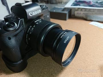 Lente macro Canon Close-Up Lens 240 52mm nella sua custodia originale. Si adatta anche a diametro obiettivi non necessariamente di 52mm tramite semplici anelli adattatori, come quello nell'ultima foto (non incluso nell'annuncio). Nelle foto la lente è mostrata su un obiettivo Canon EF-M 15-45mm.